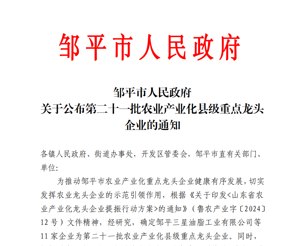 近日,邹平市人民政府公布了新一批农业产业化县级重点龙头企业名单,集团旗下邹平w66国际·利来最给力的老牌油脂工业有限公司被认定为农业产业化县级重点龙头企业。